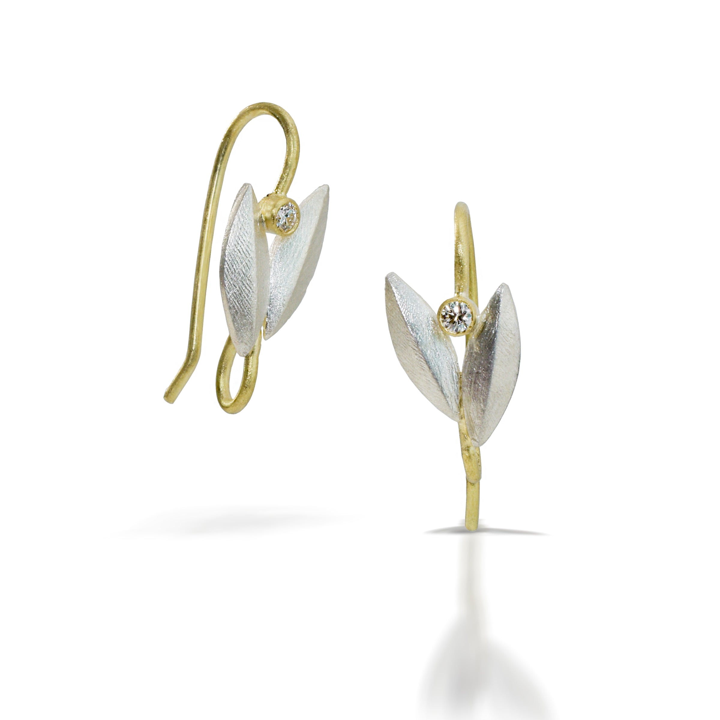 Bright textured silver, warm brushed 18k gold, and a bit of sparkle. These simple nature-inspired earrings can be worn alone or with your favorite charm hanging from the 18k yellow gold hook, subtly masquerading as a stem.