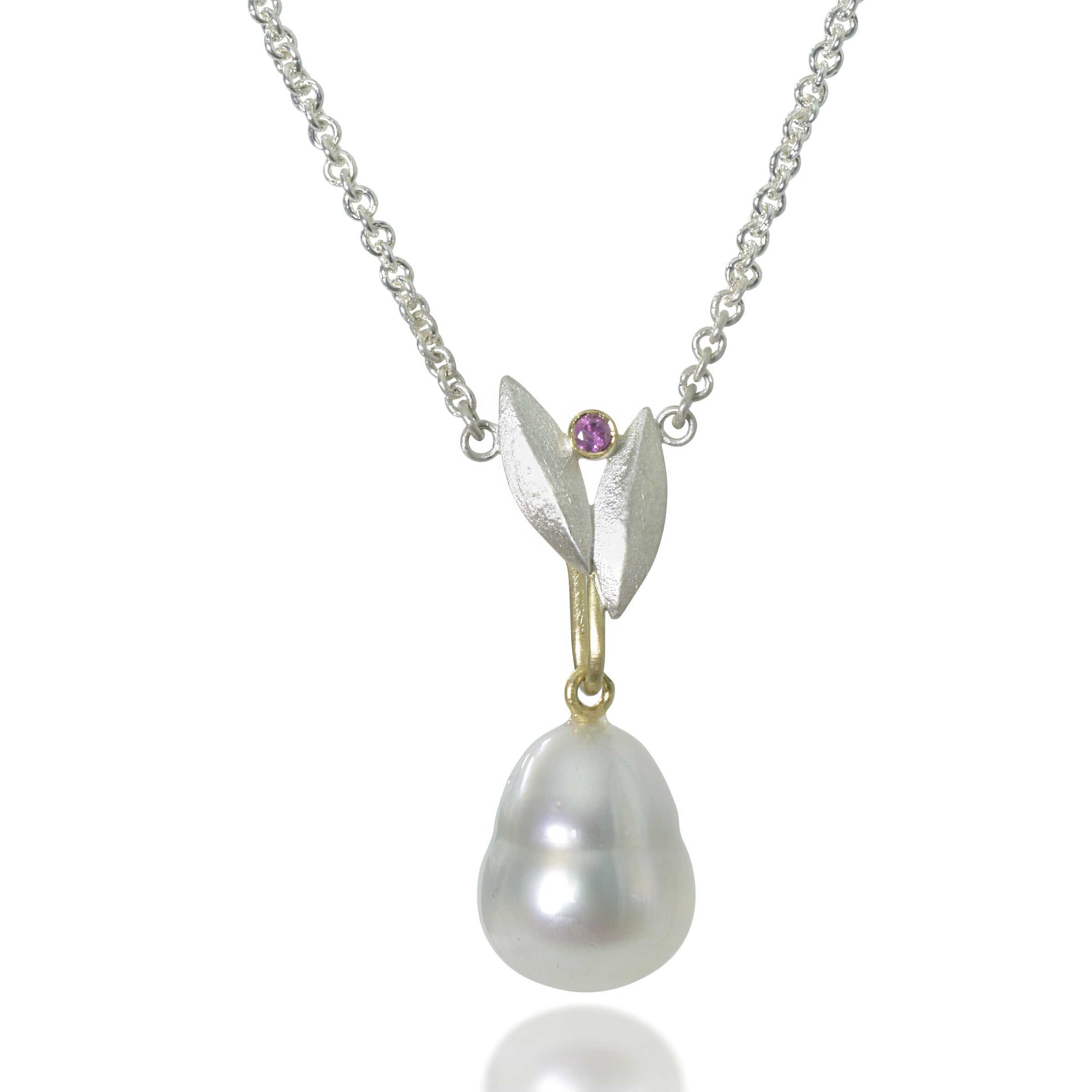 Spring brides come to mind with this simply elegant piece. A simple South Seas pearl and pink sapphire bring to mind fresh blooms and new beginnings. Interesting twist? The necklace can be worn with or without the pearl! I love a piece of jewelry that does double duty!