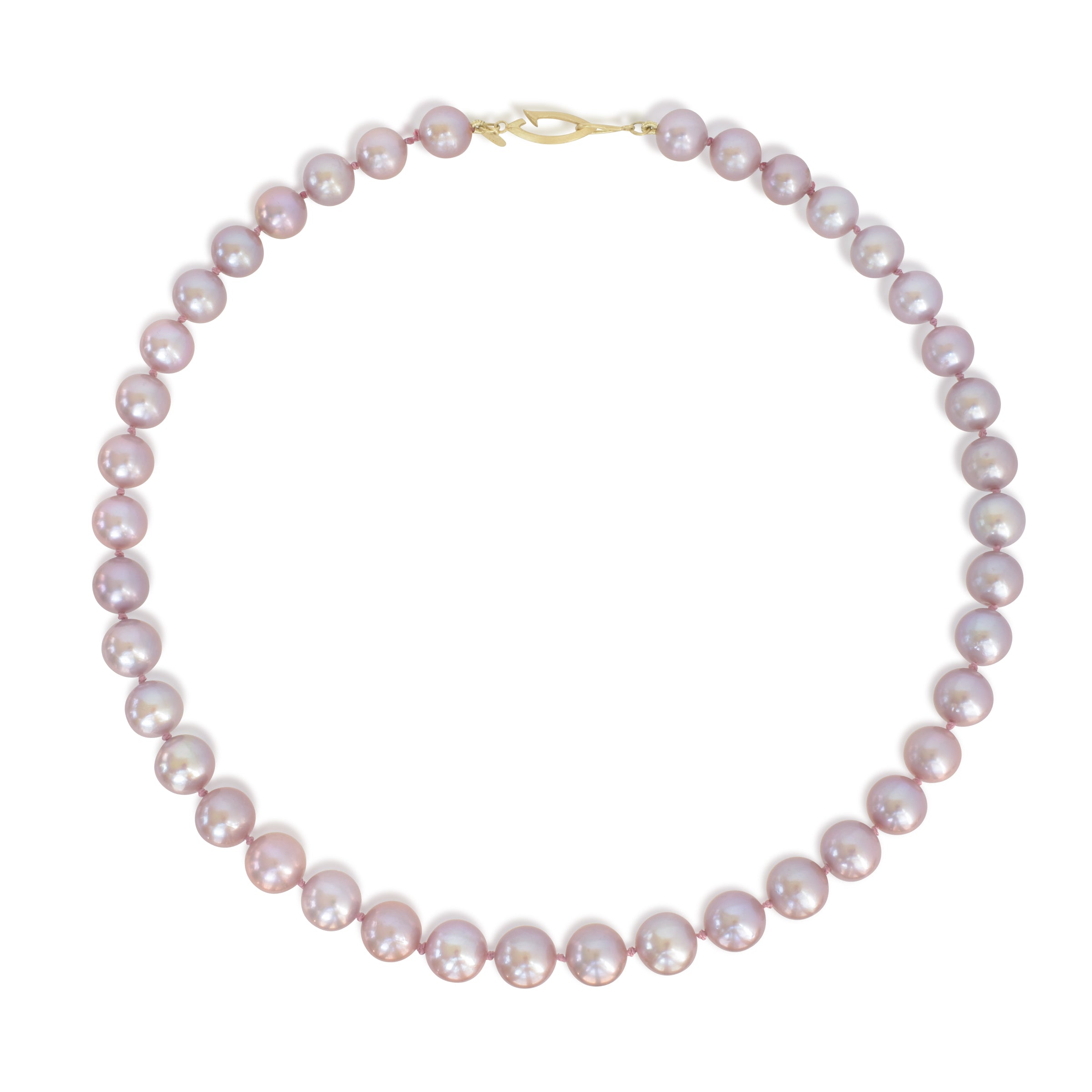 Pink freshwater pearls with a striking 18k yellow gold clasp. These pearls are sophisticated but not stuffy. They pick up the colors that surround them to subtly shift in color and blend. You will love the versatility of this piece in your jewelry arsenal.