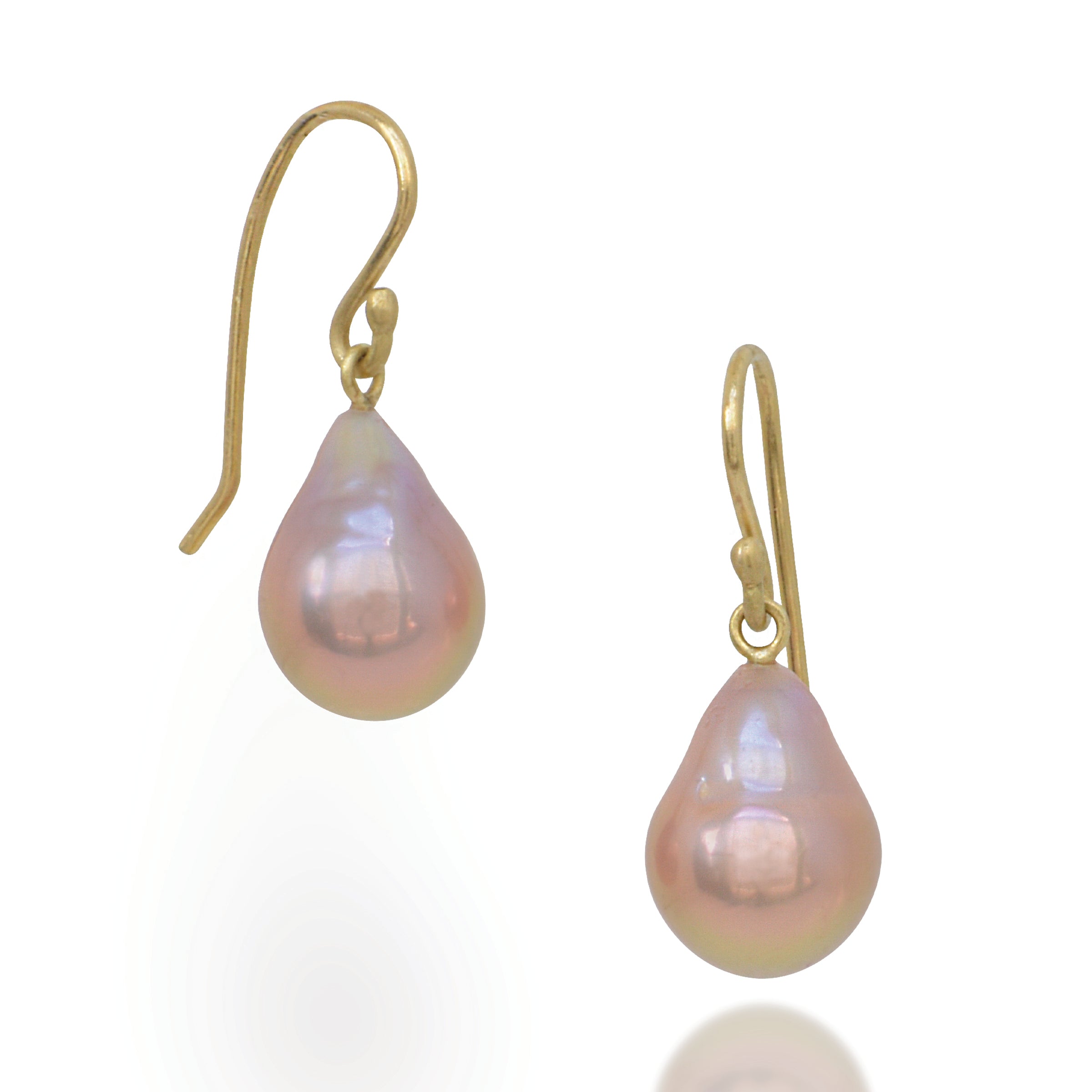 Baroque Peach freshwater pearls are simply set with 18k yellow gold ear wires.